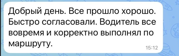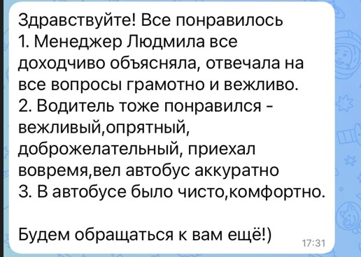 Добрый день! Всё прошло замечательно. И менеджеру и водителю огромное спасибо. Люди , которые действительно знают свое дело!!! Автобус чистый, удобный, поездка прошла комфортно.