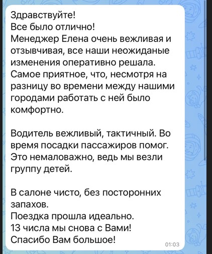 Все отзывыДобрый день! 1. Работа менеджера — на отлично, претензий нет. 2. Водитель — опыт и профессионализм, прекрасное знание города, грамотное вождение. Искренняя благодарность! 3. Автобус в отличном состоянии, очень комфортабельный и удобный для 10-12 человек. Может заезжать на выделенную полосу для автобусов в аэропорту, что особенно важно при встрече и проводах больших групп.