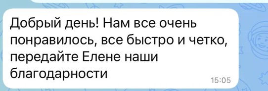Наш менеджер Елена Б. замечательный человек и профессионал! Всегда была на связи, оперативно направляла информацию, ответила на все вопросы, была вежлива и доброжелательна. Благодаря ей оформление документов прошло быстро и безболезненно.