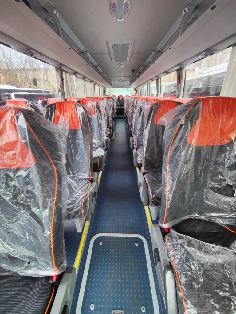 - Комфортный и просторный салон: анатомические кресла, которые можно сдвинуть в проход, двухточечные ремни безопасности, USB-порты, удобное расстояние между рядами и широкий проход.