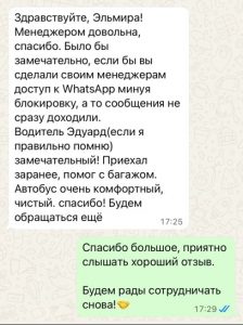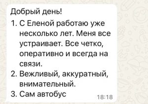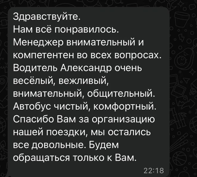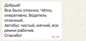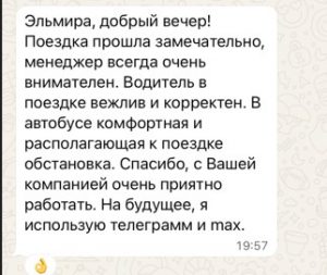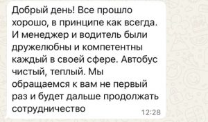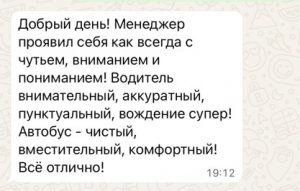 Здравствуйте, Эльмира. Все было настолько прекрасно, что даже неожиданно, я обратилась к вам как к первой компании, которая была первой в поиске Яндекса. Менеджер все очень быстро и чётко оформила, водитель Антон был очень доброжелателен, вежлив, отлично знал маршрут. Автобус чистый, красивый. Надеюсь на дальнейшее сотрудничество. Спасибо )