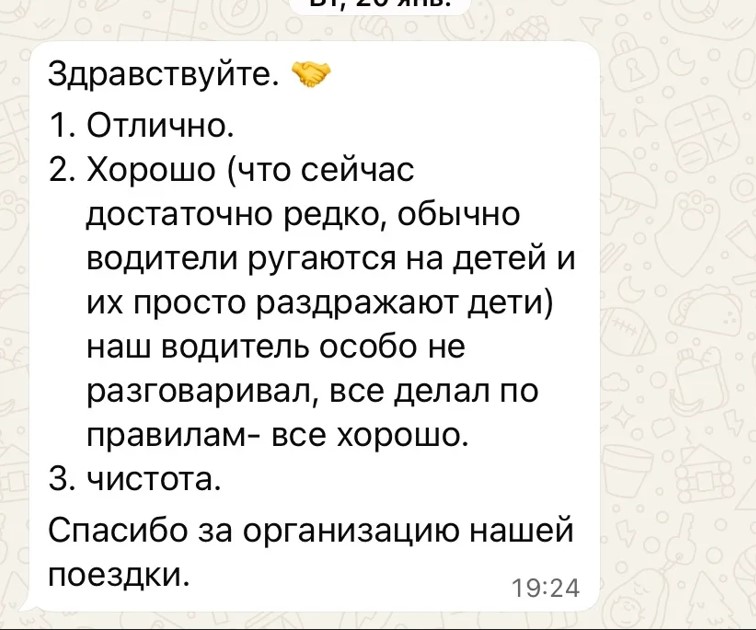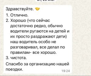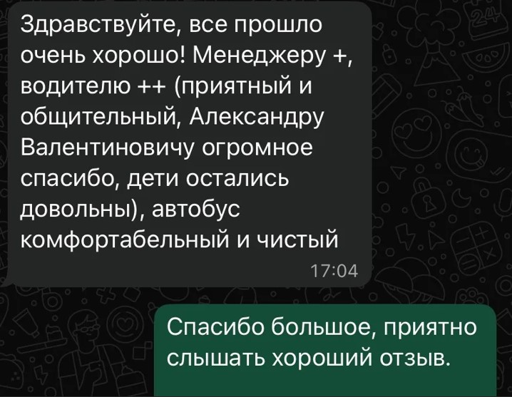 Добрый день. Поездка прошла отлично! Менеджер был всегда на связи, все пояснял и оперативно отвечал на вопросы. Водитель в поездке проявил себя как настоящий профессионал. Дал возможность без спешки рассадить 30 детей, пристегнуть, и даже включил мультик на мониторе) Посадка, высадка пассажиров была проведена без спешки, на безопасных участках. Отличное комфортное вождение! Все документы и оплата были проверены водителем перед отправкой. Автобус комфортный, единственное, не хватило сетки для вещей на спинках автобуса, чтобы убрать водичку. Большое спасибо за отличный сервис! Обязательно воспользуемся услугами вашей компании еще)