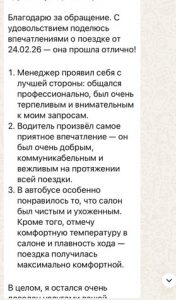 Благодарю за обращение. С удовольствием поделюсь впечатлениями о поездке от 24.02.26 — она прошла отлично!