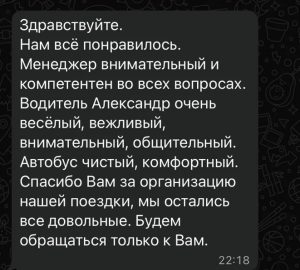 Большая благодарность всем вам за прекрасную организацию поездок на автобусах на любые расстояния. Какие бы запросы у нас ни возникали, вы всегда справлялись с задачей и не забывали о хорошем отношении к клиентам и каждому пассажиру. Всегда с удовольствием пользуемся арендой ваших автобусов.