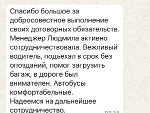 Добрый день! Все прошло отлично. Наша менеджер Людмила как всегда — на связи, быстро и оперативно все подготовила, наверное у вас все менеджеры хорошие- но наша Людмила однозначно самая лучшая. Я с детьми в этот раз не смогла поехать- но родители сказали, что все было хорошо- все вовремя, спокойный и вежливый водитель, автобус большой и чистый! В общем, очень благодарны вам за сотрудничество!!!