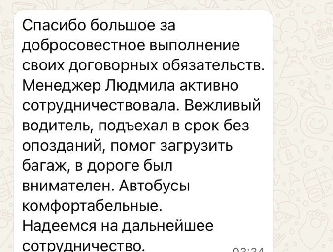 Спасибо большое за добросовестное выполнение своих договорных обязательств. Менеджер Людмила активно сотрудничествовала. Вежливый водитель, подъехал в срок без опозданий, помог загрузить багаж, в дороге был внимателен. Автобусы комфортабельные.