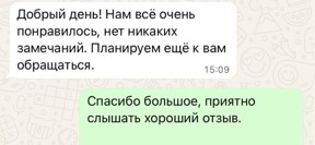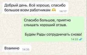 А в остальном, хотим поблагодарить за постоянную связь, качественную работу и ответы на наши вопросы. Спасибо, будем ещё рекомендовать Вас!)