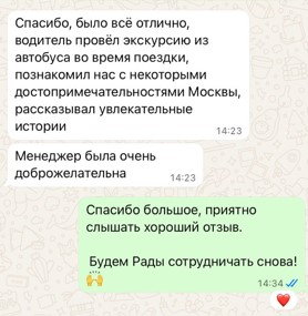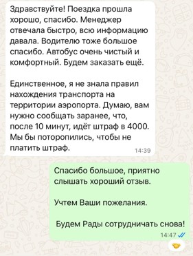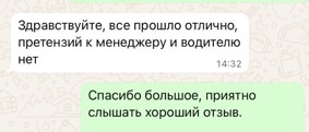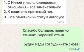 Здравствуйте! Поездка прошла хорошо, спасибо. Менеджер отвечала быстро, всю информацию давала. Водителю тоже большое спасибо. Автобус очень чистый и комфортный. Будем заказать ещё.