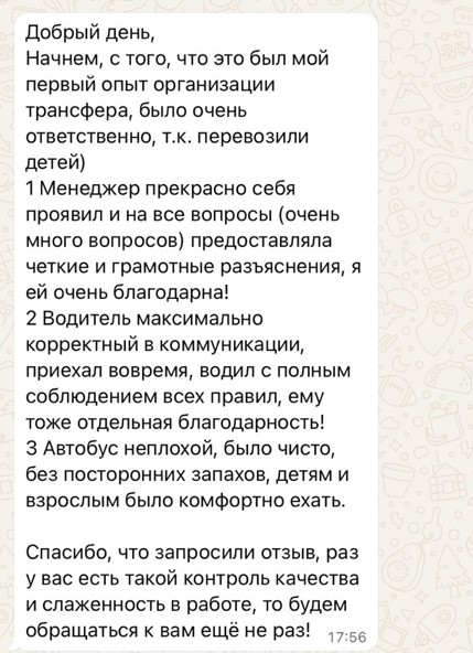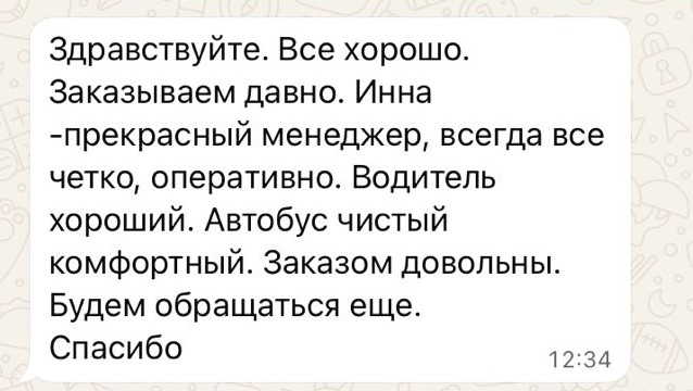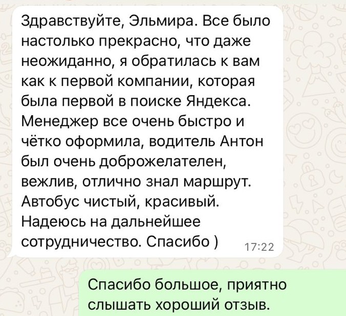 Здравствуйте, Эльмира. Все было настолько прекрасно, что даже неожиданно, я обратилась к вам как к первой компании, которая была первой в поиске Яндекса. Менеджер все очень быстро и чётко оформила, водитель Антон был очень доброжелателен, вежлив, отлично знал маршрут. Автобус чистый, красивый. Надеюсь на дальнейшее сотрудничество. Спасибо )