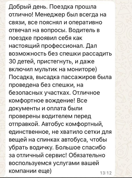 Добрый день. Поездка прошла отлично! Менеджер был всегда на связи, все пояснял и оперативно отвечал на вопросы. Водитель в поездке проявил себя как настоящий профессионал. Дал возможность без спешки рассадить 30 детей, пристегнуть, и даже включил мультик на мониторе) Посадка, высадка пассажиров была проведена без спешки, на безопасных участках. Отличное комфортное вождение! Все документы и оплата были проверены водителем перед отправкой. Автобус комфортный, единственное, не хватило сетки для вещей на спинках автобуса, чтобы убрать водичку. Большое спасибо за отличный сервис! Обязательно воспользуемся услугами вашей компании еще)