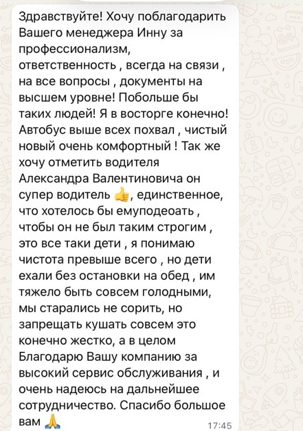 Здравствуйте! Хочу поблагодарить Вашего менеджера Инну за профессионализм, ответственность , всегда на связи , на все вопросы , документы на высшем уровне! Побольше бы таких людей! Я в восторге конечно! Автобус выше всех похвал , чистый новый очень комфортный ! Так же хочу отметить водителя Александра Валентиновича он супер водитель 👍, единственное, что хотелось бы ему пожелать , чтобы он не был таким строгим , это все таки дети , я понимаю чистота превыше всего , но дети ехали без остановки на обед , им тяжело быть совсем голодными, мы старались не сорить, но запрещать кушать совсем это конечно жестко, а в целом Благодарю Вашу компанию за высокий сервис обслуживания , и очень надеюсь на дальнейшее сотрудничество. Спасибо большое вам 🙏