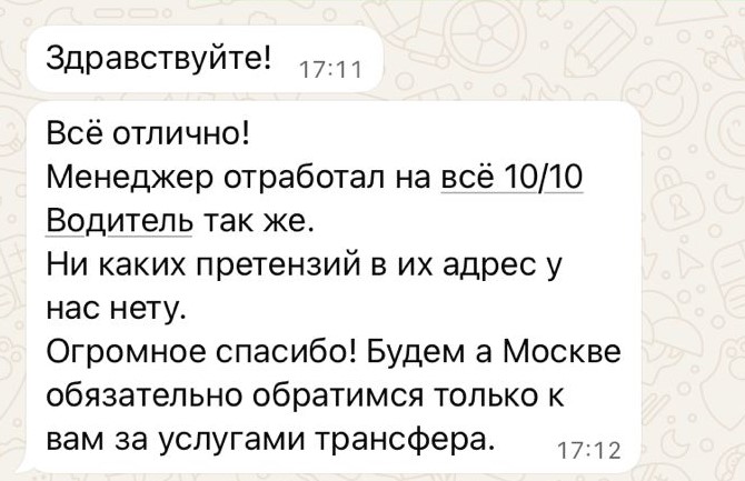 Добрый день. Полностью довольные поездкой и сопровождением. Никаких абсолютно претензий. Все прошло очень хорошо. Водитель тоже отличный!